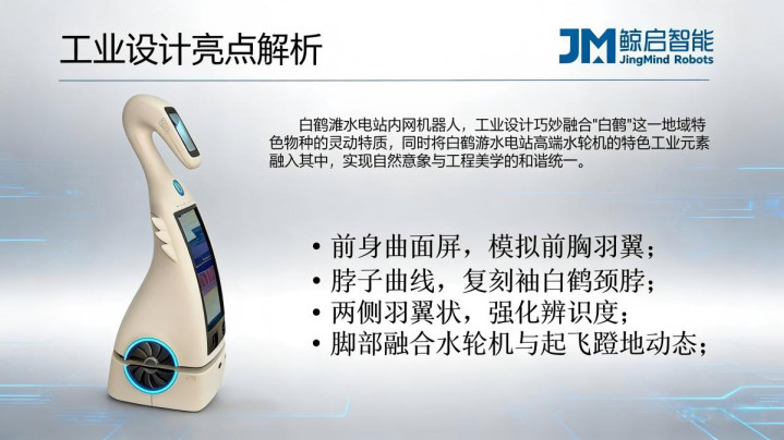 机器东说念主合座造型呈现优雅的白鹤样式,细长的脖子和扁平的鸭嘴策画,不仅视觉上亲和,也合适空气能源学旨趣。最为转换的亮点在于机器东说念主的脚步策画,其灵感径直开头于白鹤滩水电站水轮机的造型元素。