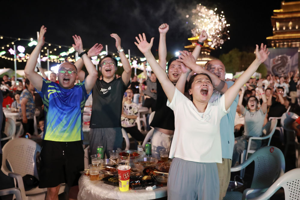 7月20日,球迷在淮安市漕运门广场不雅看“苏超”淮安队对阵无锡队的比赛。新华社发(徐昌政 摄)