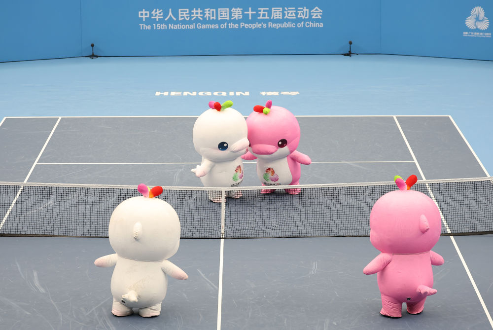 11月12日,第十五届寰宇通顺会安祥物“乐滋滋”“乐融融”在网球比赛缝隙扮演。新华社记者 张晨霖 摄