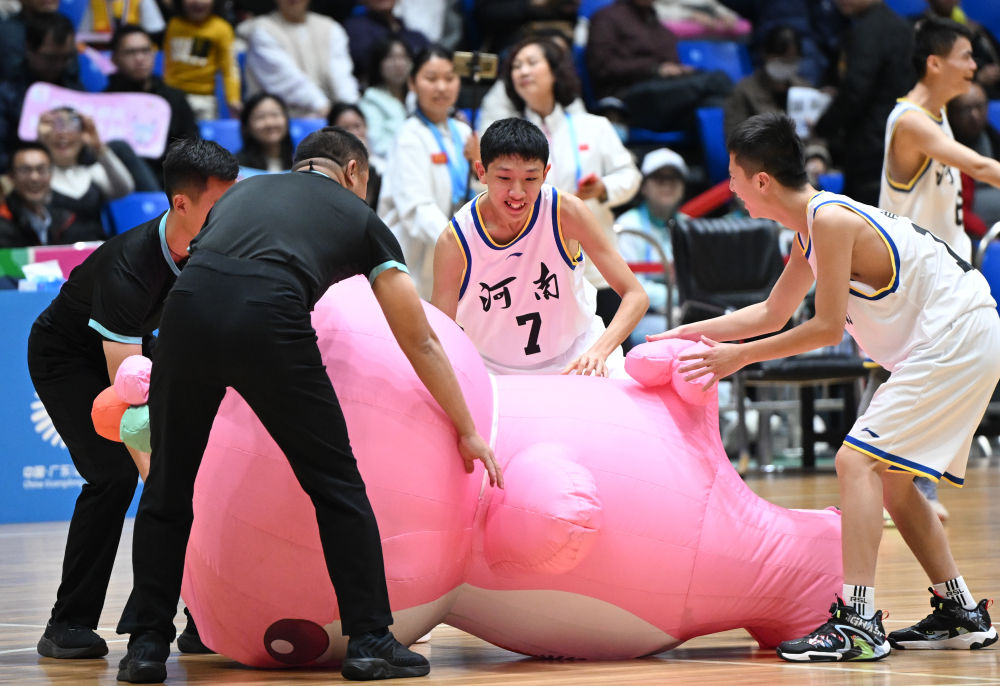 12月14日,河南队球员在比赛缝隙和安祥物“乐融融”互动。新华社记者 邓华 摄