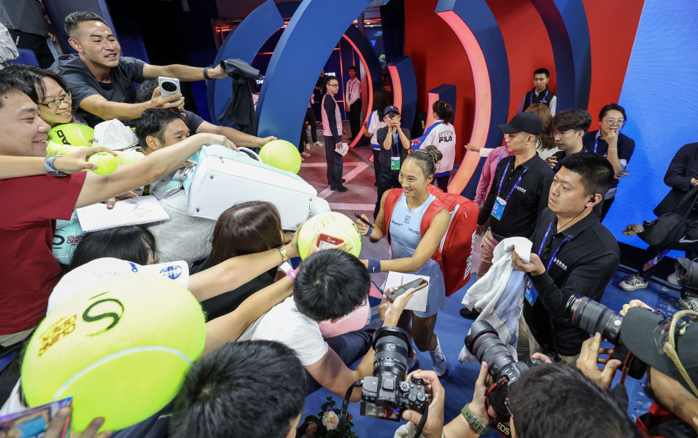 9月27日,在北京举行的2025中国网球公开赛女单第二轮与哥伦比亚选手阿朗戈的比赛后,中国选手郑钦文(中)与不雅众互动。新华社记者 白雪飞 摄